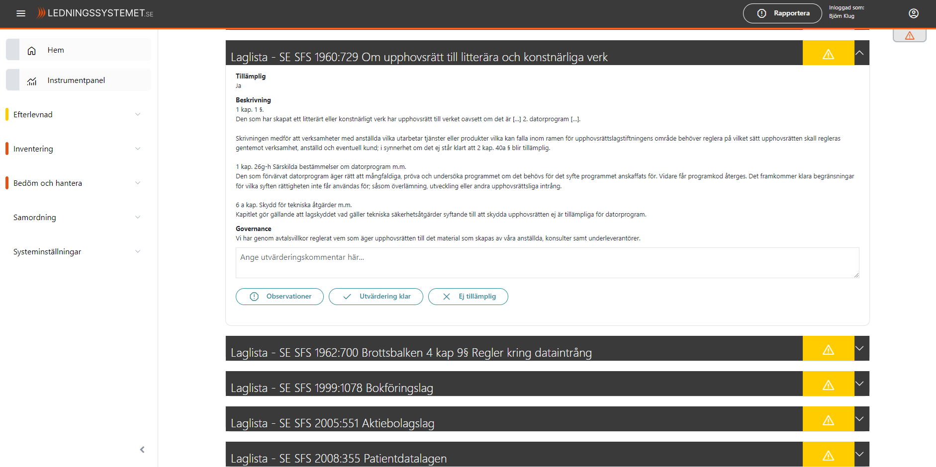 For organizations that intend to certify their work with information security, the tool provides all the conditions for systematically managing the organization’s information security work and the tool’s risk management module provides sufficient systematic design to meet, for example, the requirements of ISO 27001.