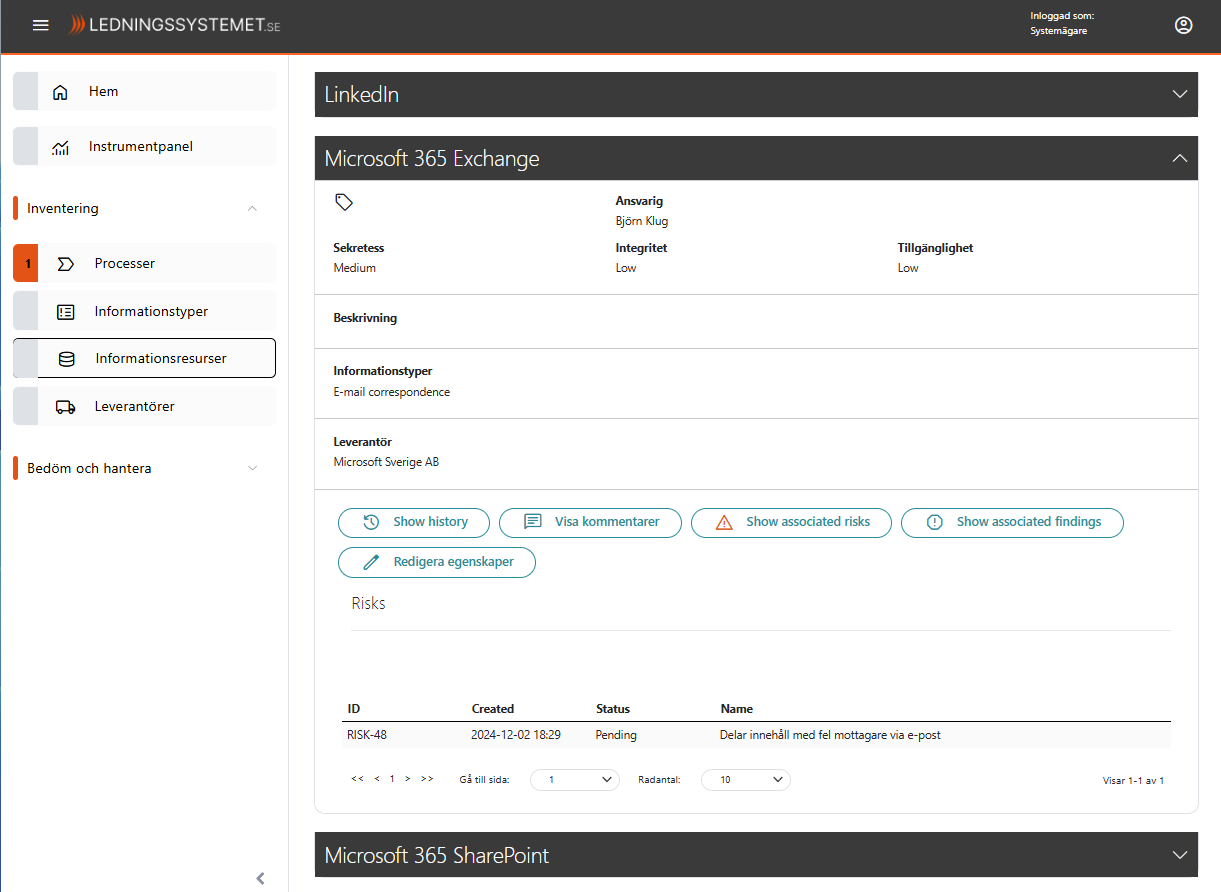 For each information type and information resource, the system owner can see which risks, improvement proposals and deviations are related to the object.